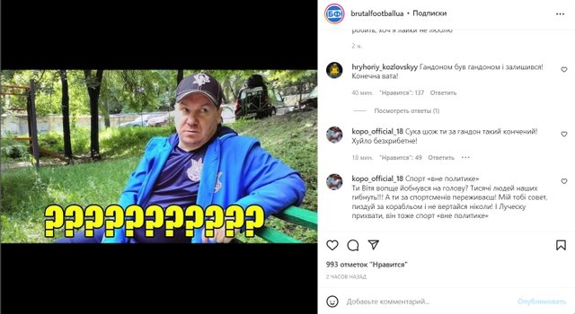 "Ган*оном, гандо*ом і залишився! Кінцева (ймовірно, мається на увазі "кінчена" – прим. Футбол 24) вата!" – написав президент Руху у коментарях Брутального футболу.
