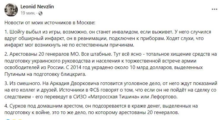 У Шойгу великий інфаркт, 20 генералів заарештовані, Сурков під домашнім арештом, - Невзлін