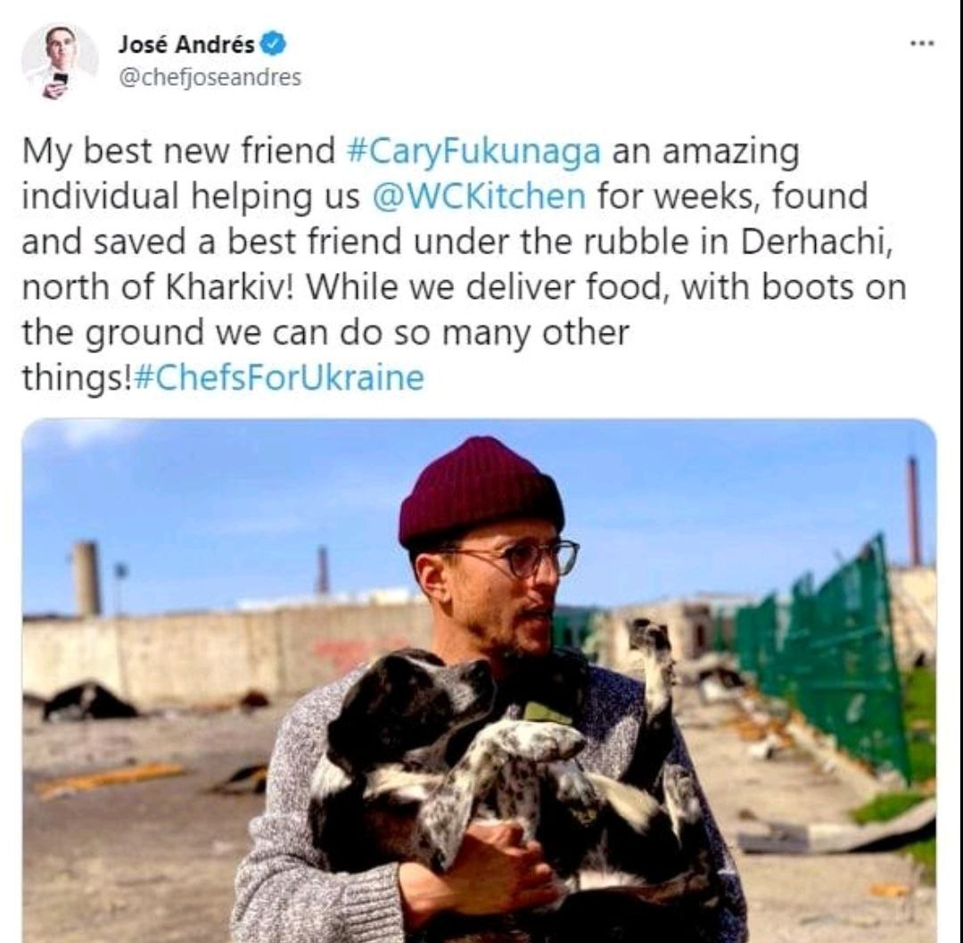 Про це написав шеф-кухар Хосе Андрес, засновник організації World Central Kitchen, з яким Кері Фукунага готує безкоштовні обіди для українців.