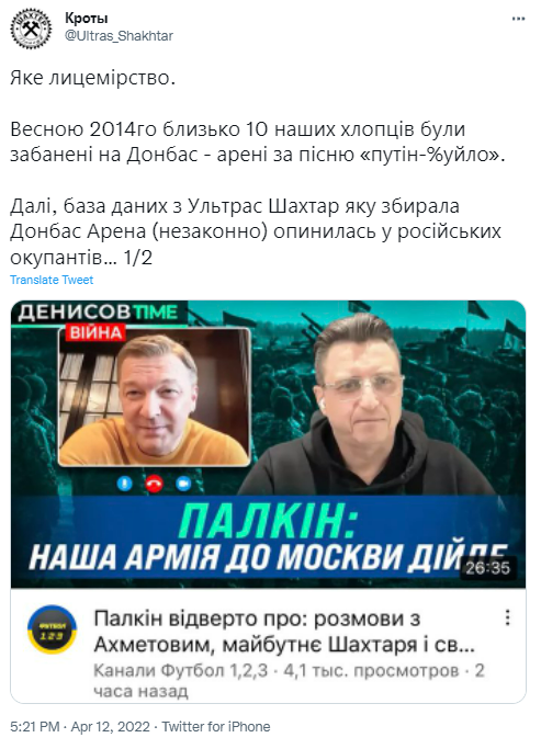 «Яке лицемірство. Весною 2014-го близько 10 наших хлопців були забанені на «Донбас Арені» за пісню «путін – х###о». Далі, база даних з ультрас «Шахтаря», яку збирала «Донбас Арена» (незаконно), опинилась у російських окупантів…