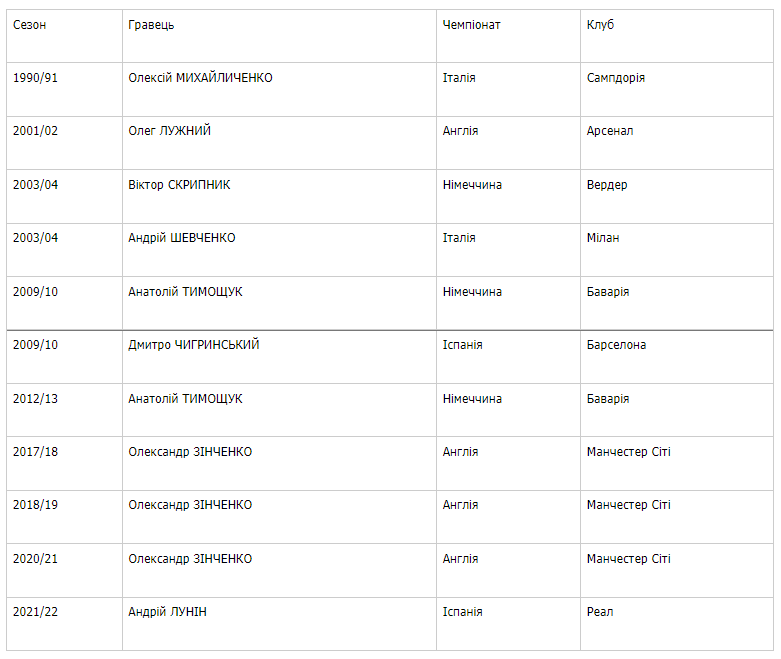 23-річний голкіпер Андрій Лунін став другим українським гравцем після Дмитра Чигринського, який виграв іспанську Ла Лігу. Усього ж наші футболісти ставали чемпіонами країн великої футбольної п'ятірки 11 разів: 4 – в Англії, 3 – у Німеччині, по 2 – в Іспанії та Італії.