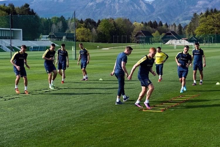 Увечері робота збірників, як і належить, продовжилася на футбольному полі. Олександр Петраков традиційно зібрав команду в коло, пояснивши характер та мету сьогоднішнього заняття. На першому етапі збору важливо напрацьовувати й функціональні, й ігрові кондиції, адже через війну у хлопців практично не було ігрової практики.
