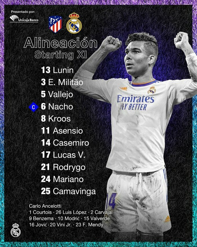 Стартовий склад «Реала»: Лунін, Васкес, Мілітао, Вальєхо, Начо, Каземіро, Кроос, Камавінга, Асенсіо, Родріго, Маріага.