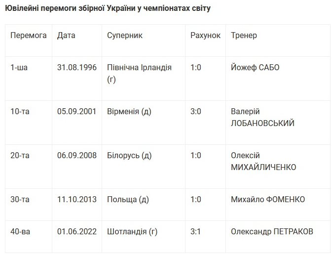 У матчі із Шотландією (3:1) збірна України відзначила одразу три переможні ювілеї. Наша національна дружина відсвяткувала 40-ву вікторію у чемпіонатах світу, у тому числі 20-ту - у гостях. А також 30-ту на чужих полях у чемпіонатах світу та Європи. 9 разів приводив українців до перемоги на «світі» Олег Блохін, 7 - Михайло Фоменко, по 6 - Олексій Михайличенко та Йожеф Сабо, 5 - Андрій Шевченко, 4 - Валерій Лобановський та 3 - Олександр Петраков.