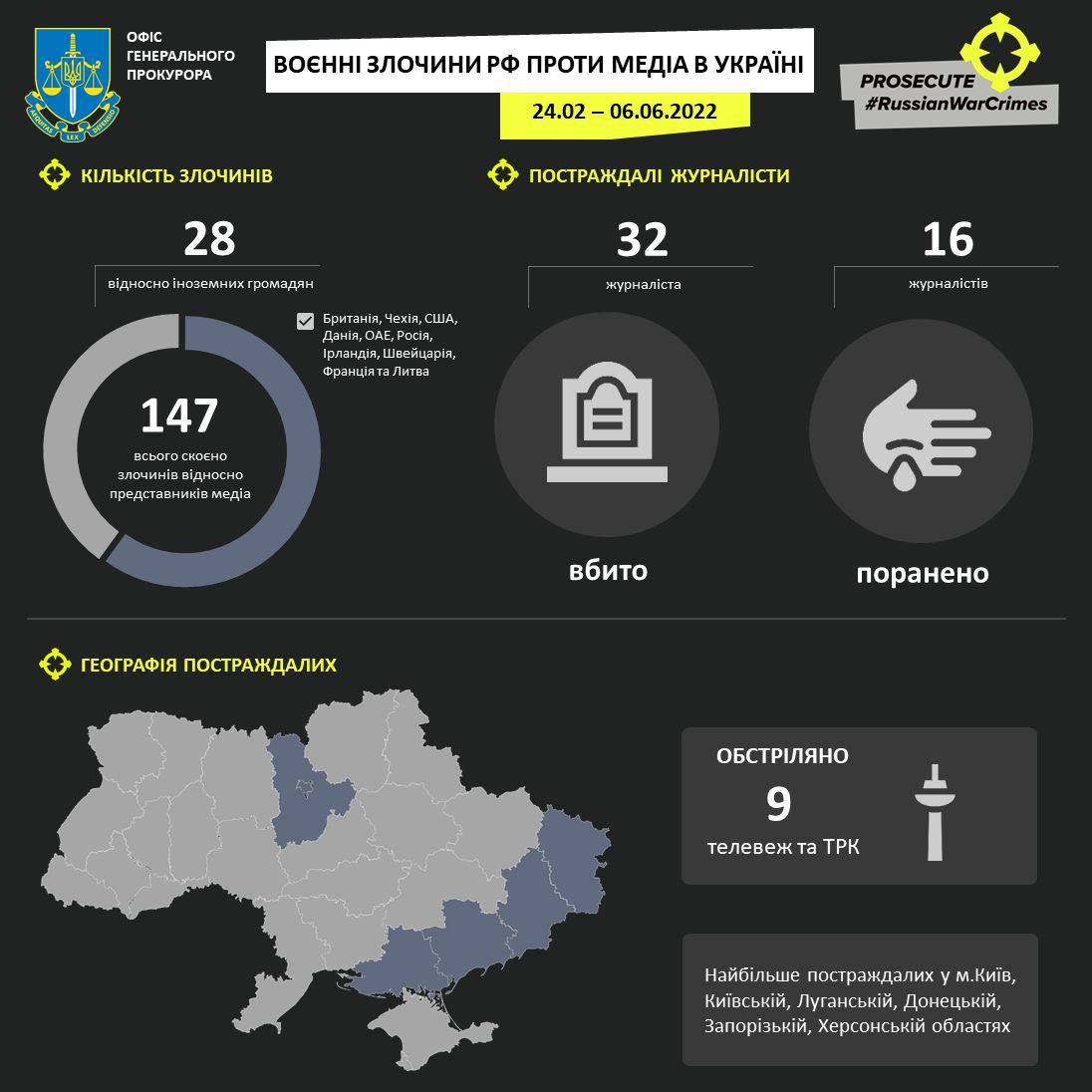 Розслідуються злочинів рф відносно 147 представників ЗМІ, 28 з них є іноземними громадянами.