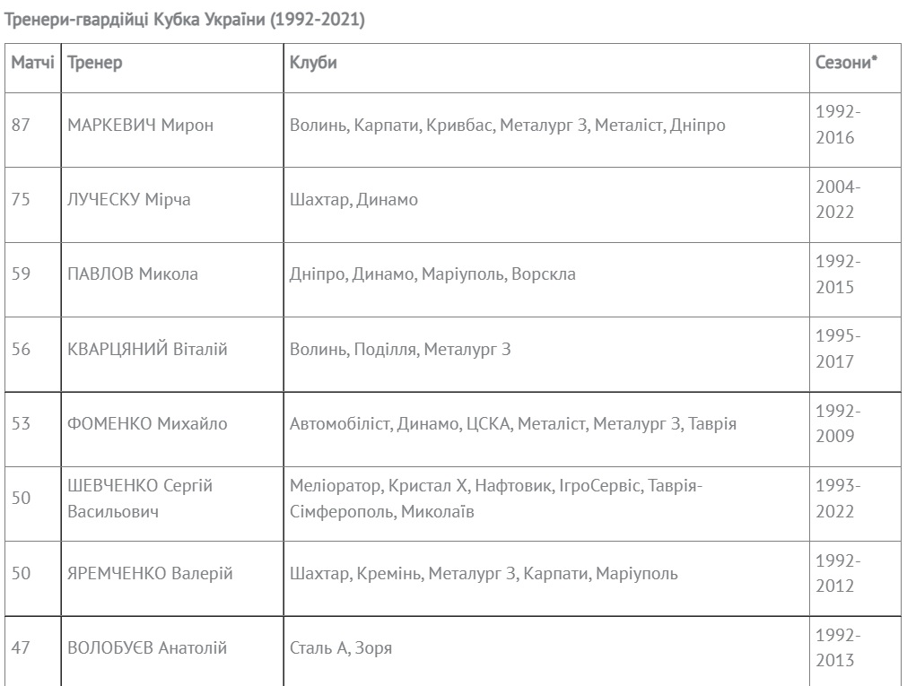 На близьку відстань до вітчизняного фахівця наблизився румун Мірча Луческу, в активі якого 75 ігор у Кубку України.