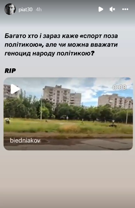 «Багато хто і зараз каже «спорт поза політикою», але чи можна вважати геноцид народу політикою?», - написав Пятов у себе в Інстаграмі.