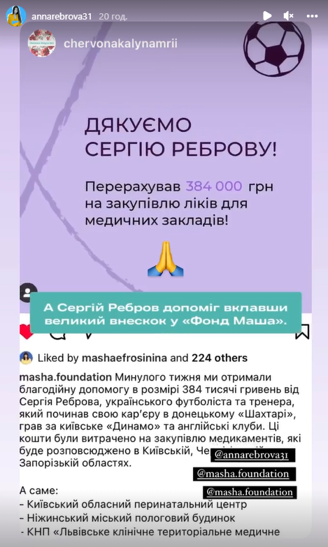 Головний тренер Аль-Айну Сергій Ребров пожертвував 384 тисячі гривень на купівлю медикаментів для медичних закладів Київської, Чернігівської та Запорізької областей.