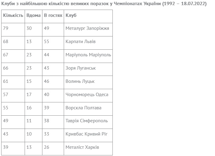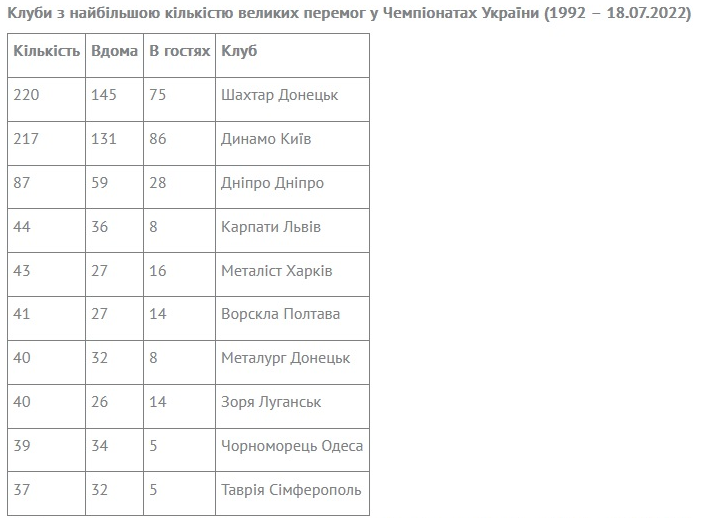 Найбільше розгромних перемог виявилося в гравців «Шахтаря» – 7, які на один пункт випередили своїх конкурентів із «Динамо». Також «гірники» очолюють список команд як із найбільшою кількістю усіх великих перемог – 220, так і розгромних «вікторій» на своєму полі – 145. Динамівці ж найчастіше громили суперників, виступаючи в гостях – 86 перемог із різницею в три і більше м’ячів.