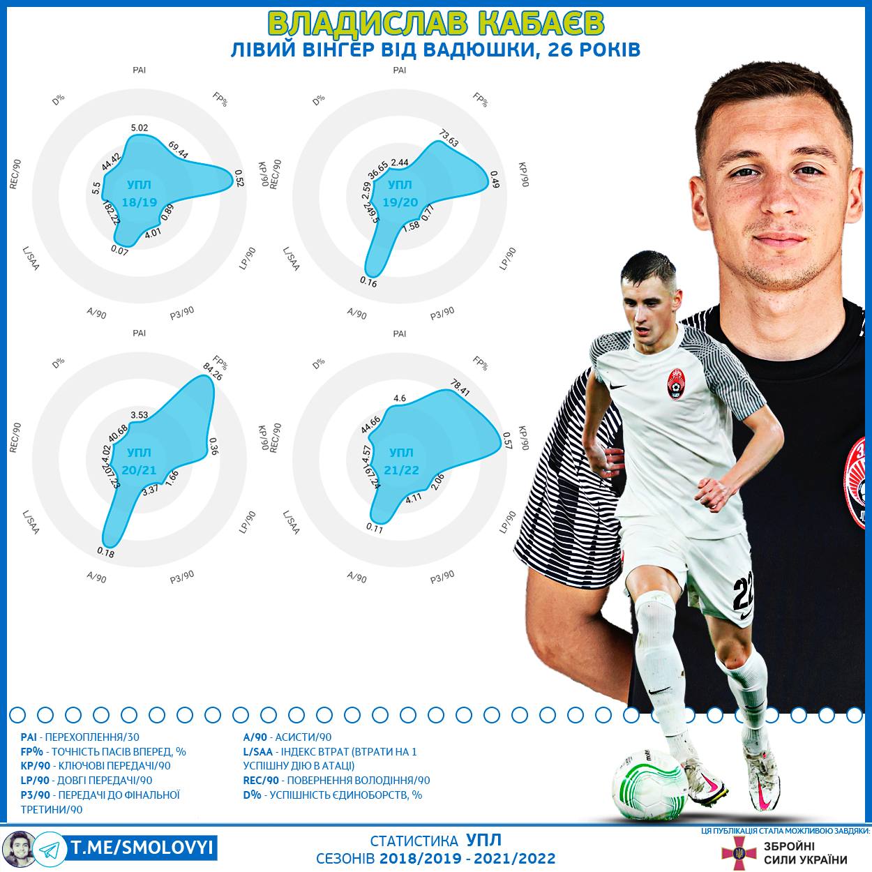 Інший солідний аргумент ЗА: Скрипник привчив Кабаєва до високої інтенсивності гри БЕЗ м’яча. Тут жодних зауважень, адже Зоря Скрипника була лідером УПЛ з інтенсивності пресингу та єдиноборств. Просто подивіться на його PAI індекс (перехоплення на 30 хвилин володіння суперника) на радарах останніх двох сезонів (3.53/90 та 4.6/90).