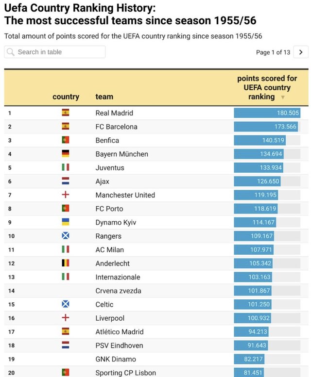 Популярний блогер Swiss Football Data склав рейтинг найуспішніших єврокубкових команд. Тобто тих, які завоювали найбільше пунктів для своїх асоціацій в таблицю коефіцієнтів з сезону-1955/56.