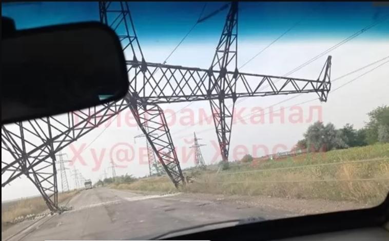 У свою чергу Telegram-канал Ху@вий Херсон уточнює, що високовольтний стовп упав на трасу, що йде на селище Чаплинка, біля села Новокам'янка в Каховському районі.