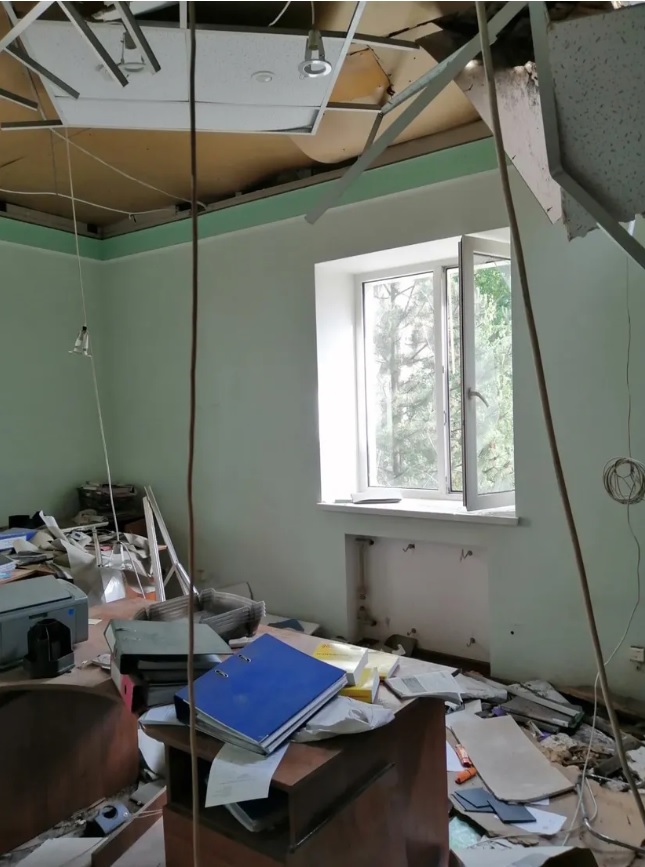 Будівля та дах офісу отримали декілька прямих влучань російських снарядів. Але нітрохи не менші збитки завдали дії російських мародерів всередині будівлі.