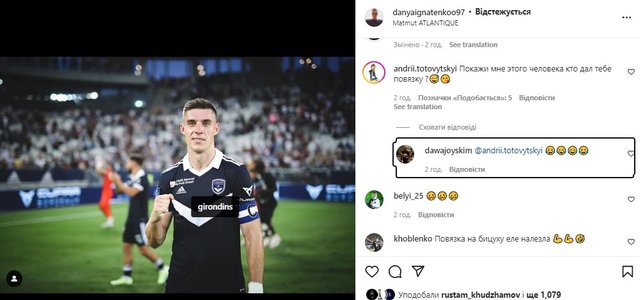 У коментарях почали кепкувати з українця, зокрема хавбек Шахтаря Андрій Тотовицький (разом грали за Маріуполь – прим.) попросив показати ту людину, яка дала Ігнатенку пов'язку. Дмитро Хобленко також не зміг не пожартувати щодо світлини Данила: "Пов'язка на біцуху (біцепс – прим.) ледь налізла".