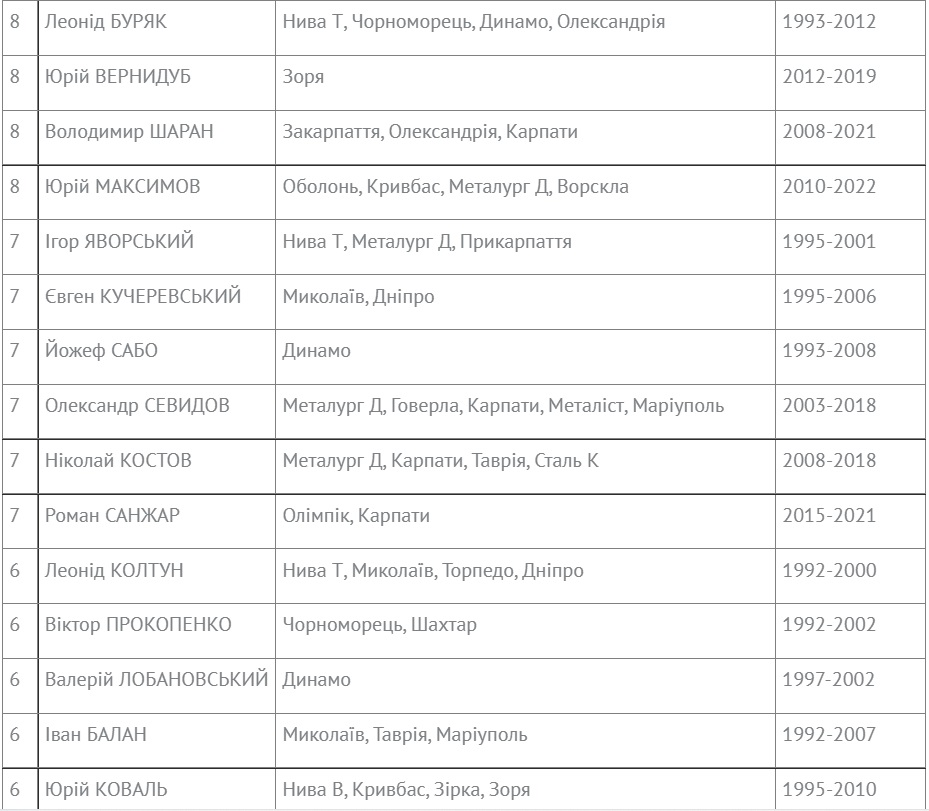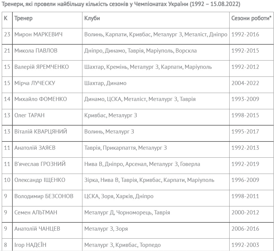 Список старожилів українських чемпіонатів очолює Мирон Маркевич, який на чолі шести клубів керував діями своїх підопічних у 23-х (!) сезонах.