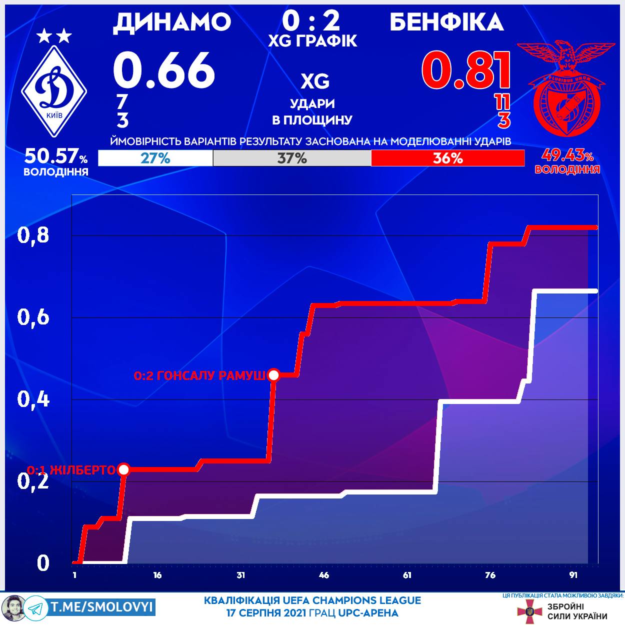 Не гра, а суцільні протиріччя. Маючи криву та перекошену архітектуру, через відсутність можливостей грати в глибину зліва (Шепелєв) та в центрі (Бєсєдін) - все одно створили щось. Уявляєте рівень концентрації Бенфіки в захисті, якщо в нас проходили в першому таймі ЄДИНІ з можливих варіантів створення загрози з чітким вектором зліва направо. Циганков був нашою єдиною опцією: одного разу офсайд Бєсєдіна, а потім два удари (0.11 та 0.05 xG). І це лише за півгодини. Забагато, як для солідної оборони, тож вона явно не надійна.