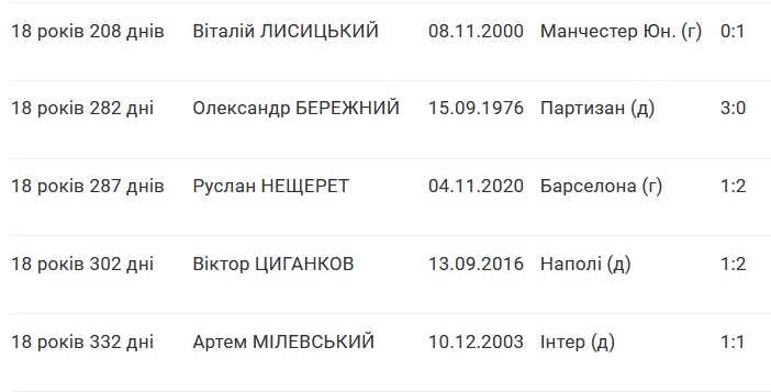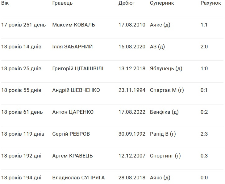 Найбільш ранні дебюти гравців «Динамо» в єврокубках