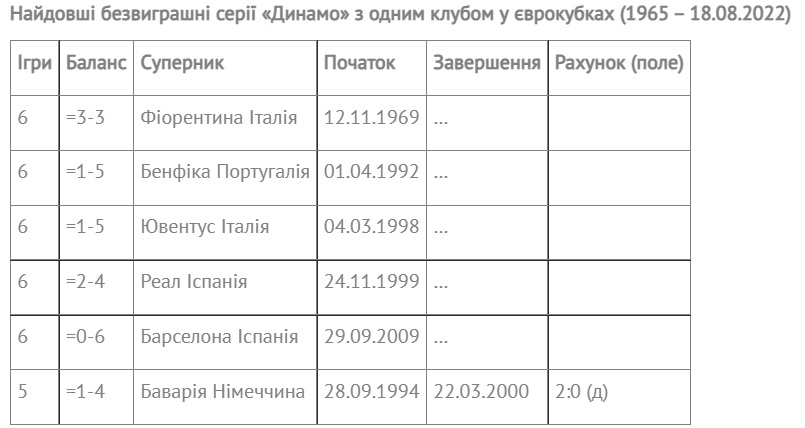 Безвиграшна серія динамівців саме з цим португальським клубом розпочалася ще у 1992 році і триває вже 6 матчів поспіль: нічия та 5 поразок. При цьому безгольова єврокубкова серія «Динамо» з «Бенфікою» з 27 листопада 1991 року триває вже 599 (!) хвилин.