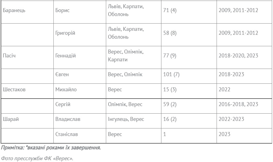 Загалом маємо вже 10 пар братів-близнюків, які брали участь у чемпіонатах України. Переважно вони виступали в одних і тих же клубах, але часом доля розкидала їх по різних футбольних командах.