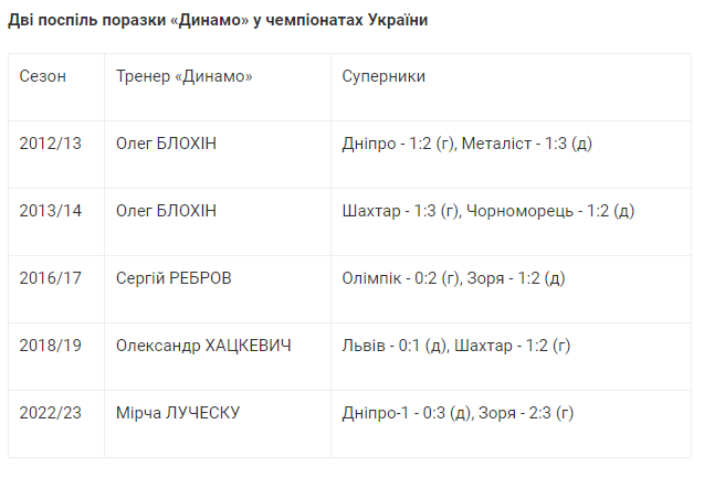 «Динамо», поступившись «Зорі» з рахунком 2:3, повторило особистий антирекорд. Кияни вп'яте в історії програли два матчі поспіль у чемпіонатах України. Раніше двічі біло-сині зазнавали двох поразок поспіль за Олега Блохіна і по разу за Сергія Реброва та Олександра Хацкевича.