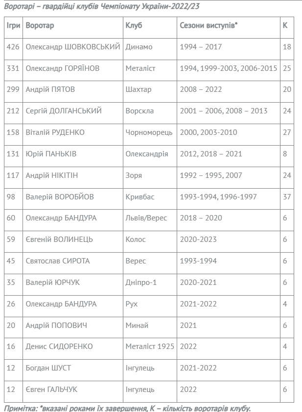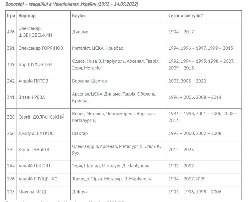 Серед діючих воротарів-гвардійців виділимо Андрія Пятова («Шахтар») та Юрія Паньківа («Рух»).