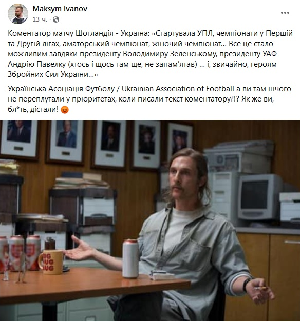 Українська Асоціація Футболу, а ви там нічого не переплутали у пріоритетах, коли писали текст коментатору? Як ви, б***ь, дістали!".
