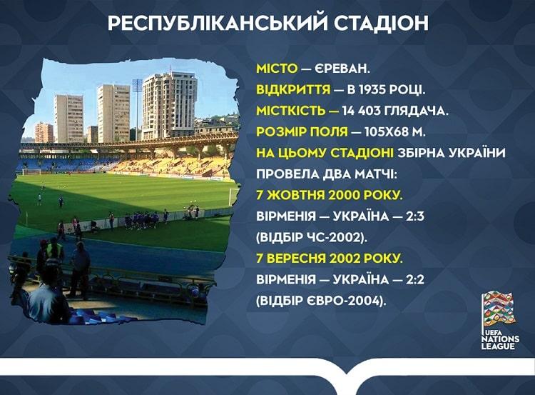 На Республіканському стадіоні в Єревані, де відбудеться матч 5-го туру групового раунду Ліги націй-2022/2023 Вірменія — Україна (початок — о 16.00 за київським часом), наша команда грала вже двічі.
