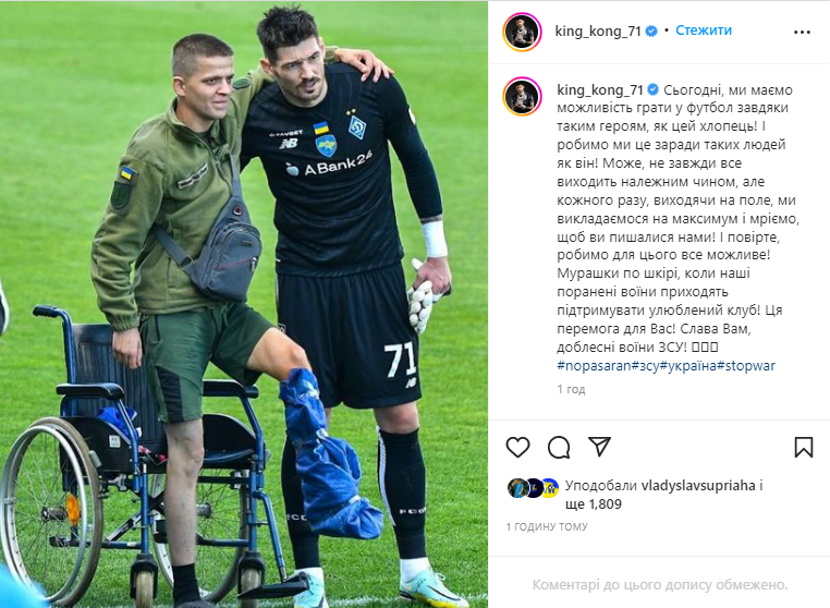 Воротар "Динамо" Денис Бойко у своєму інстаграмі висловив вдячність захисникам нашої країни.