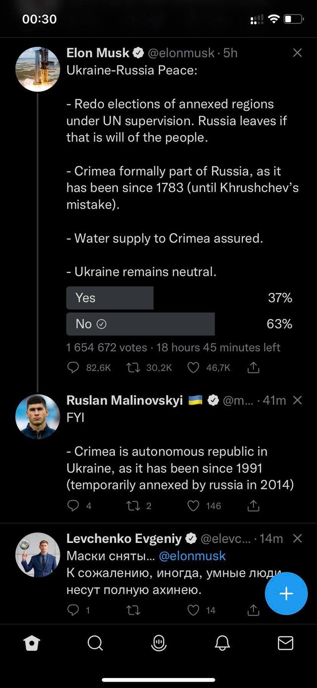 У своєму твіттері Ілон Маск запропонував такі умови для припинення війни між Україною та Росією: Крим має стати частиною Росії, забезпечення півострова водопостачанням, а Україна має лишитись нейтральною державою та не вступати до НАТО. Логічно, що це викликало обурення в українців.
