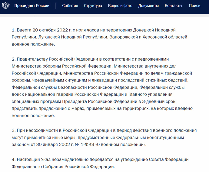 Пряма мова Путіна: "Мною підписано указ про введення воєнного стану в цих чотирьох суб'єктах Російської Федерації. Він негайно буде направлений на затвердження до Ради Федерації. Про ухвалене рішення проінформована і Державна Дума".