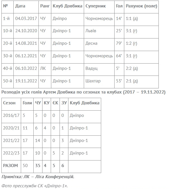 Ювілейні голи Артема Довбика за українські команди (2017 – 19.11.2022)
