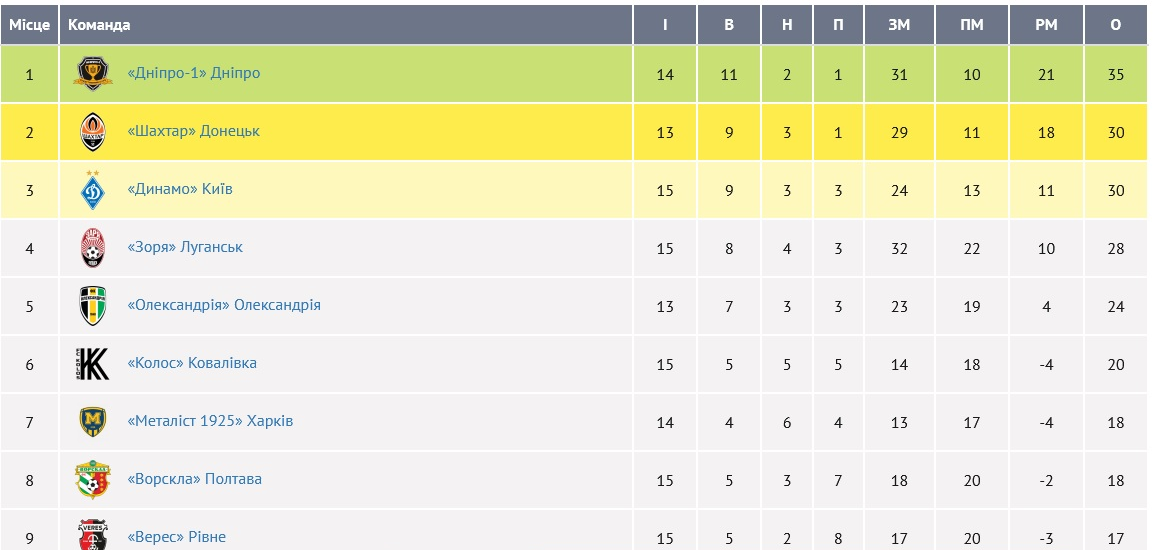 Зазначимо, що на 1-му місці знаходиться СК "Дніпро-1" (35 очок), а на другому "Шахтар" (30 очок) Дніпряни зіграли на один матч менше киян, а гірники на два.