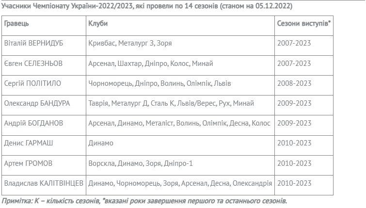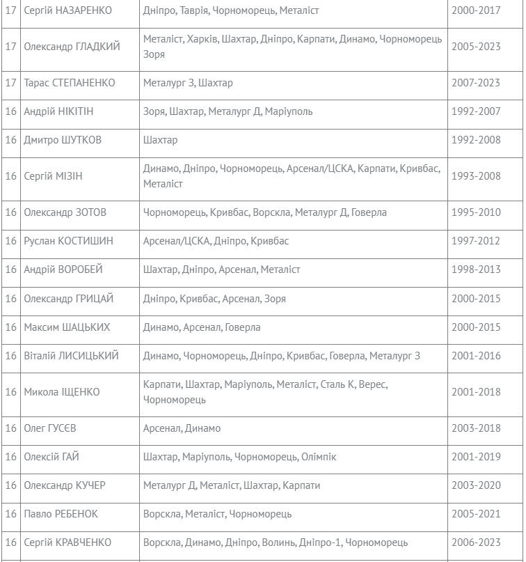 Разом із тим, викликає інтерес і список старожилів українських Чемпіонатів. І очолює цей рейтинг багаторічний воротар «Динамо» Олександр Шовковський, який брав участь у 24-х (!) сезонах. Серед гравців, які виступали у нинішньому Чемпіонаті-2022/2023, виділимо Андрія Пятова («Шахтар»), який почав уже 20-й сезон і разом з іншим воротарем Олександром Горяїновим за цим показником розділяє 3-4 місця.