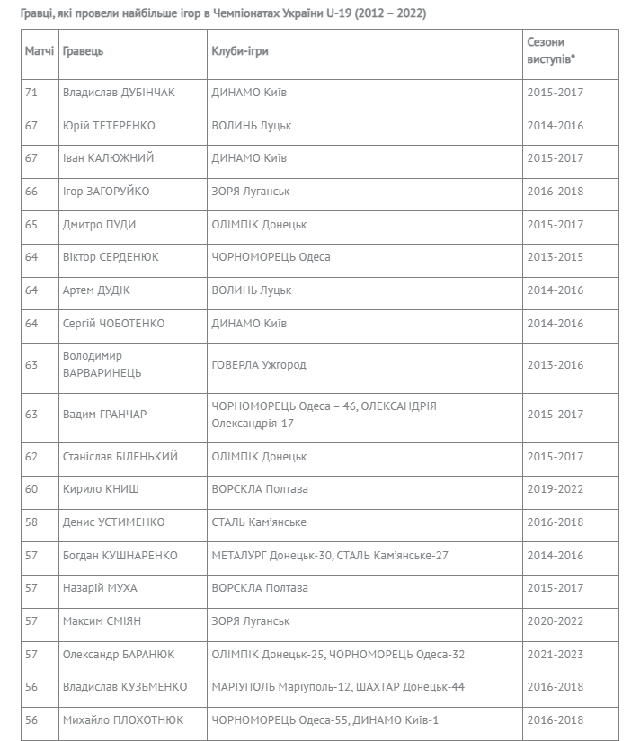 Починаючи з 2012 року, за весь час проведення Чемпіонатів України серед гравців віком до 19-ти років (U-19) у цих змаганнях було задіяно вже 3067 футболістів із 32-х клубів