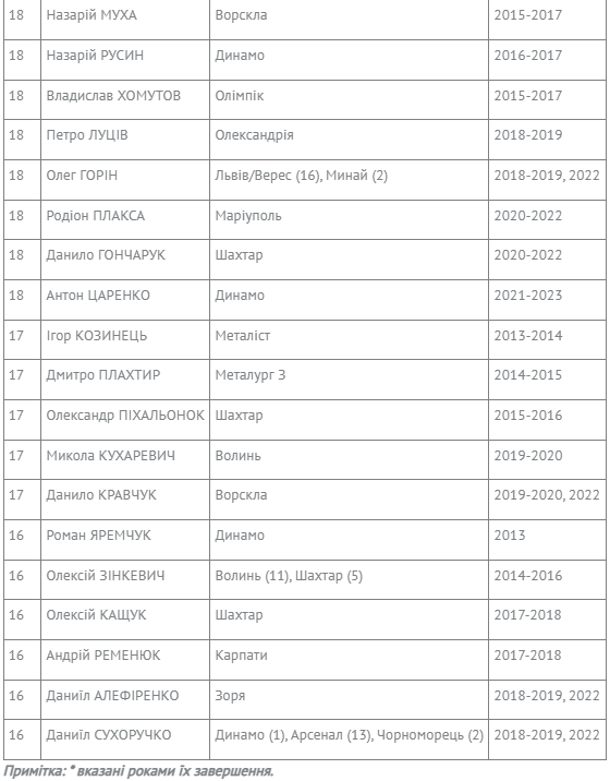 За час проведення усіх 11-ти Чемпіонатів юнацьких команд України (U-19: вік гравців до 19-ти років) у цих змаганнях забивали м’ячі вже 1483 (!) гравці