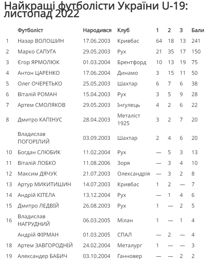 Проект Золотий Талант склав новий актуальний рейтинг, в якому зібрані найкращі футболісти України U-19 — за підсумками листопада 2022 року. Розставити молодих українських гравців 2003 року народження (і менших) по місцях нам допомогли 120 експертів
