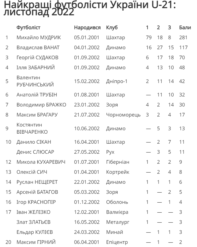 Проект Золотий Талант підготував черговий рейтинг, в якому зібрані найкращі футболісти України, не старші 21 року. Він складений за підсумками листопада 2022 року з молодих українських гравців 2001—2002 років народження на основі опитування більше, ніж 100 експертів