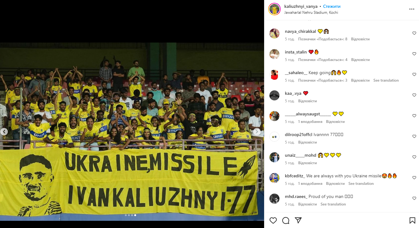 У своєму Instagram 24-річний футболіст поділився фото з одного із матчів чемпіонату Індії, на якому фанати вивісили банер із надписом "Українська ракета Іван Калюжний", який присвятили саме українцю.