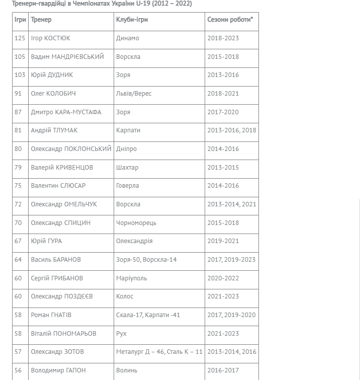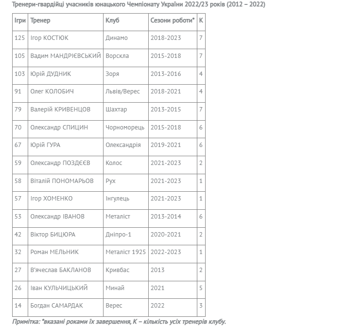 Починаючи з 2012 року, вже 130 наставників керували діями 32-х клубів Чемпіонатів України серед юнацьких команд (U-19).