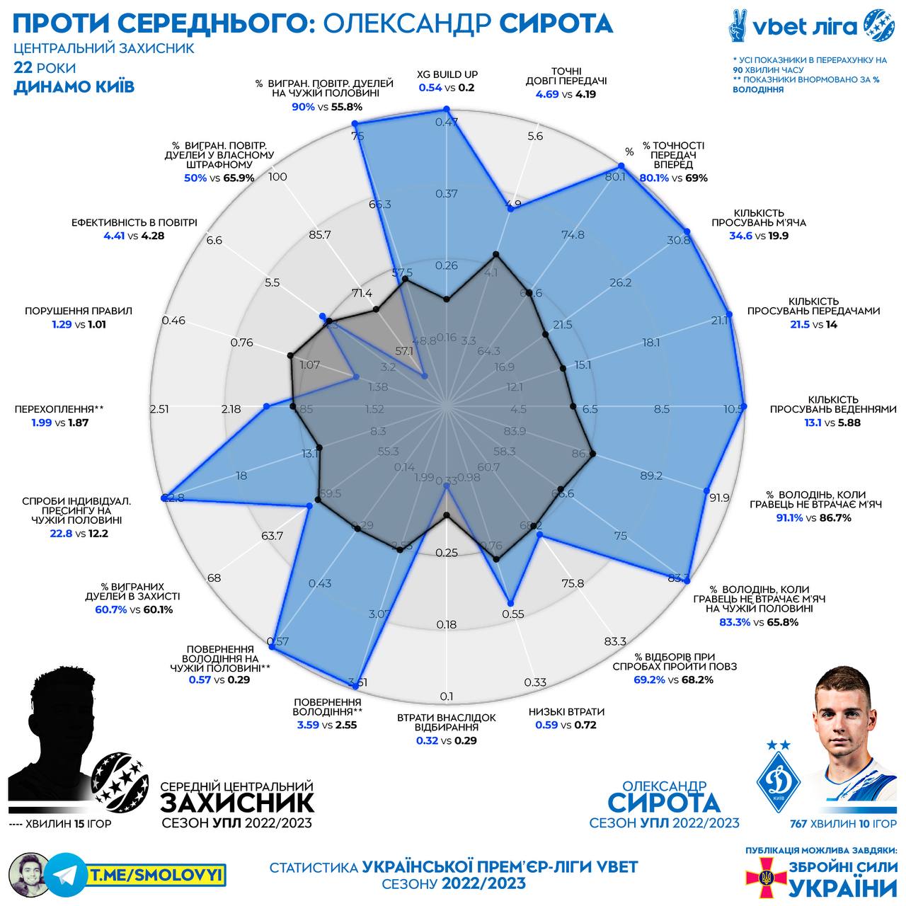 ⁃ по-друге, не рандомна гра в просуванні теж позначається, Сирота переважає середнього ЦЗ в точності передач вперед (+11.1%)