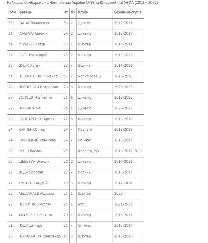 І лідерство у списку найкращих голеадорів-юнаків займає Владислав Ванат, який у сезонах 2018/19–2020/21 років у складі «Динамо» забив 38 (!) м’ячів. У юнацьких Чемпіонатах України (ЧУ) Ванат відзначався 36 разів і в Юнацькій лізі УЄФА (ЛУ) – 2.
