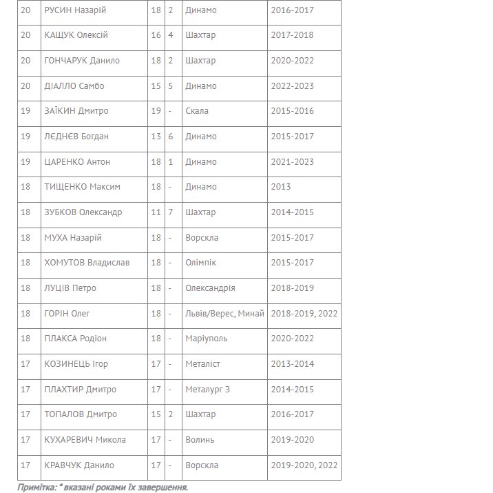 За період проведення усіх 11-ти Чемпіонатів юнацьких команд України (U-19: вік гравців до 19-ти років) у цих змаганнях забивали м’ячі вже 1482 (!) гравці з 32-х клубів