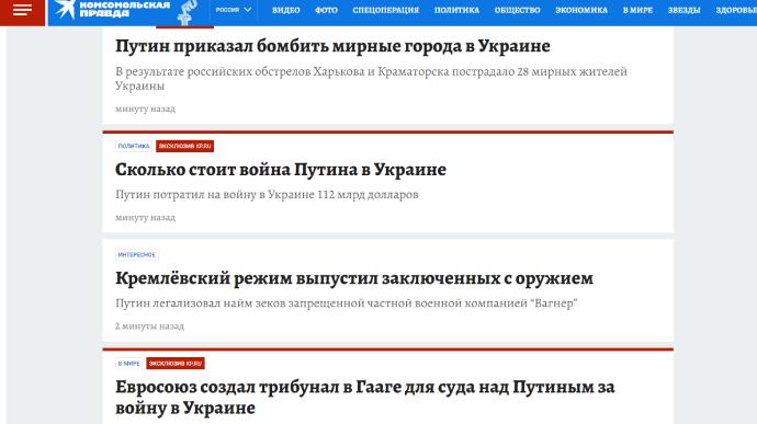 На сайті російського пропагандистського видання "Комсомольская правда" ввечері 11 лютого з'явилися щонайменше 10 публікацій, які засуджують вторгнення РФ в Україну.