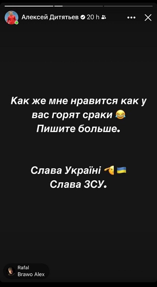 "Як же мені подобається, як у вас горять ср*ки. Пишіть більше. Слава Україні. Слава ЗСУ", – написав Дитятьєв і показав невдахам промовистий середній палець.