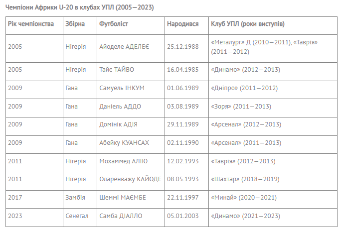 А представники саме українських клубів раніше двічі здобували бронзові нагороди чемпіонату Африки U-20: 2009 рік — Франк Теміле («Динамо»), 2013 рік — Мохаммед Алію («Таврія»). Обидва — нігерійці.
