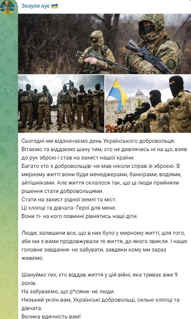 "Сьогодні ми відзначаємо день Українського добровольця. Вітаємо та віддаємо шану тим, хто не дивлячись ні на що, взяв до рук зброю і став на захист нашої країни.