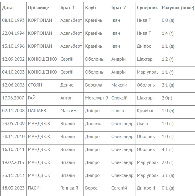 Усі матчі різних клубів рідних братів у Чемпіонатах України (1992 – 19.03.2023)