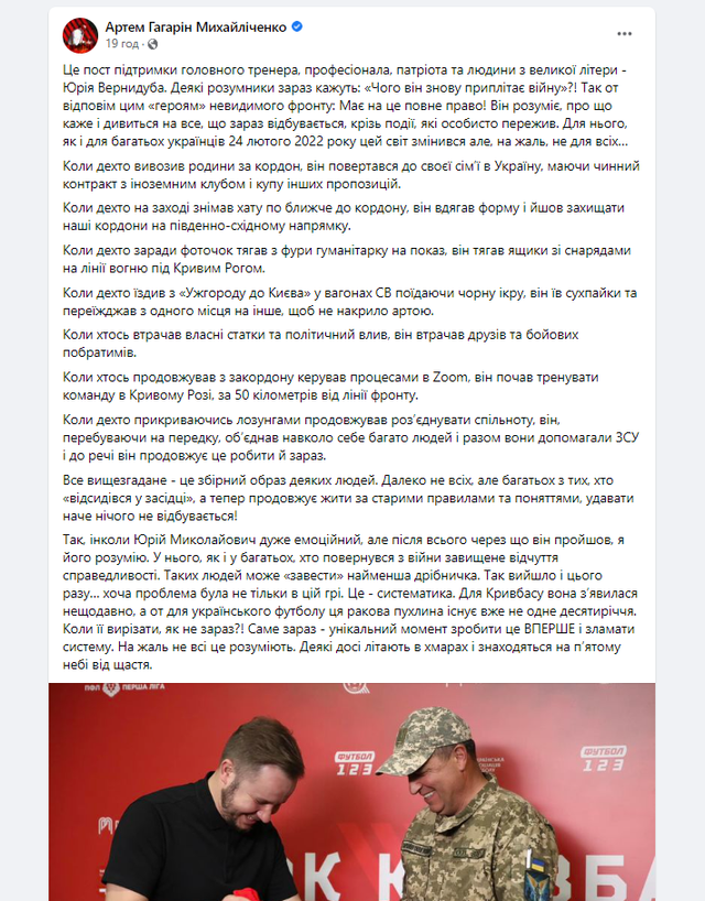 Функціонер криворіжців Артем Гагарін підтримав наставника команди Юрія Вернидуба.