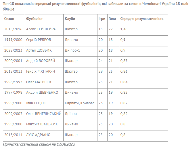 Цікаво, що серед футболістів, які забивали як мінімум 18 голів за один ЧУ (таких випадків вже 28), Довбик — один з кращих за середньою результативністю і ділить 2—3 місця в рейтингу з Сергієм Ребровим. Більше 20-ти років тому форвард «Динамо» також штампував голи, наче на конвеєрі, після чого поїхав підкорювати АПЛ (до «Тоттенгема»).
