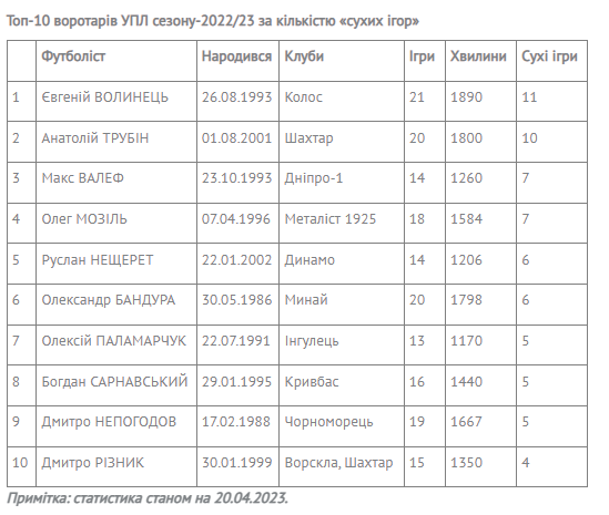 Очолює рейтинг Волинець (11 матчів без пропущених голів), одразу за ним розташувався Трубін (10), який навесні скоротив відставання від більш досвідченого колеги до мінімуму. У 2023 році «Колос» провів шість матчів в УПЛ (в чотирьох голів не пропускав), а «Шахтар» — вісім матчів (в п’яти не пропускав). І Волинець, і Трубін відіграли усі ці матчі.
